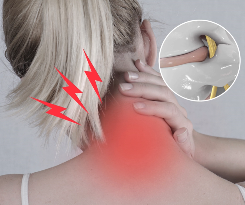 And because nerves are very sensitive, when the disk presses the nerve it radiates sharp, stabbing pain through your neck.